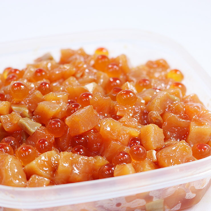 原材料・産地 【鮭】白鮭(北海道) 【漬け込みたれ】醤油、発酵調味料、たん白加水分解物、食塩、果糖ぶどう糖液糖、酵母エキス 【いくら】鮭卵(北海道)、ソルビット、調味料(アミノ酸等)、酸化防止剤、(ビタミンC)、パプリカ色素、香料 (一部に大豆・小麦・さけ・いくらを含む) 商品説明 旬の時期に獲れた新鮮で質の良い白鮭を使い、いくらと鮭の角切りをオリジナルの調味液で合わせています。