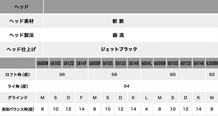 番手 5608M 5610S 5612D 5614F 5808M 5810S 5812D ロフト角(度) 56 58 ライ角(度) 64 バンス角(度) 8 10 12 14 8 10 12 グラインド M S D F M S D クラブ長さ(インチ) 35.25 35 番手 5814K 6004L 6008M 6010S 6012D 6014K 6208M ロフト角(度) 58 60 62 ライ角(度) 64 バンス角(度) 14 4 8 10 12 14 8 グラインド K L M S D K M クラブ長さ(インチ) 35 ※クラブの基準レングスは上記の表に記載されている値となります。